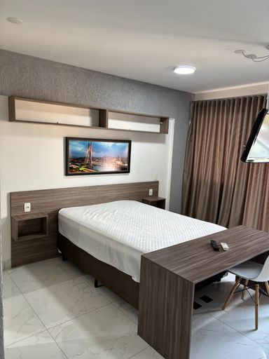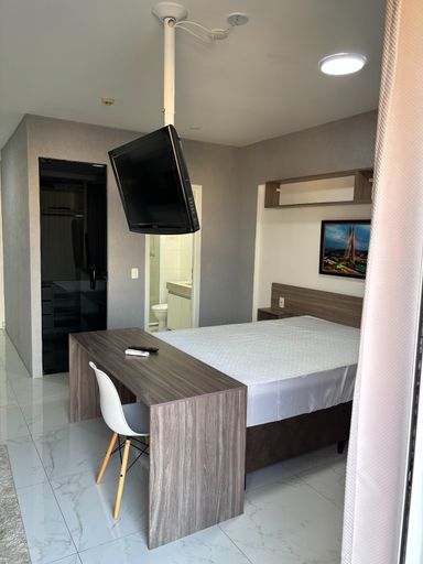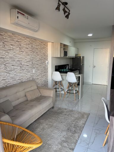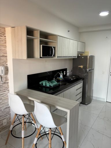Lindo flat COMPLETO, MOBILIADO E EQUIPADO, com geladeira cônsul 110w + transformador, fogão elétrico simples duas bocas, micro-ondas, banquetas brancas, cadeira descanso, TV 32”, cama box + colchão novo com travesseiro, ar condicionado LG, cortina, sofá com almofadas, tapete sala, móveis planejados sala, cozinha e banheiro e closet. Chuveiro a gás. Na cobertura: salão de festas, piscina coberta aquecida e piscina externa, academia, salão de jogos, lavanderia completa com 2 usos mensais incluídos no valor do condomínio. Louças e talheres.